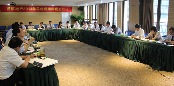 为积极应对当前市场环境,明晰各项目公司、各职能中心上半年的工作计划完成情况,明确下半年重点工作规划,7月18-19日,“德信地产2014年总经理半年度述职会”在德信地产集团有限公司本部4楼会议室顺利举行。德信地产集团有限公司总经理费忠敏等经营班子成员及各项目公司、各职能中心主要负责出席了此次会议。37000威尼斯董事长助理马可一、资金管理中心总监张金钟一同出席。
